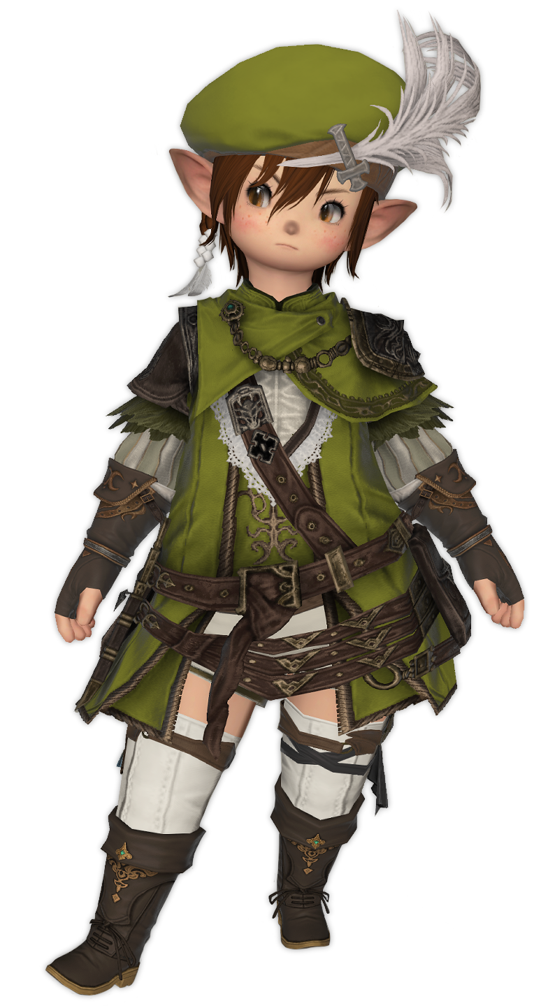 Despite having a Hyurian mother and Lalafellin father, Wigi appears full Lalafell rather than a split hybrid. That being said, her Hyur genes do manifest in subtle ways: she's a few inches taller than an average Lalafell, and her Plainsfolk ears appear smaller in length than what's usual.